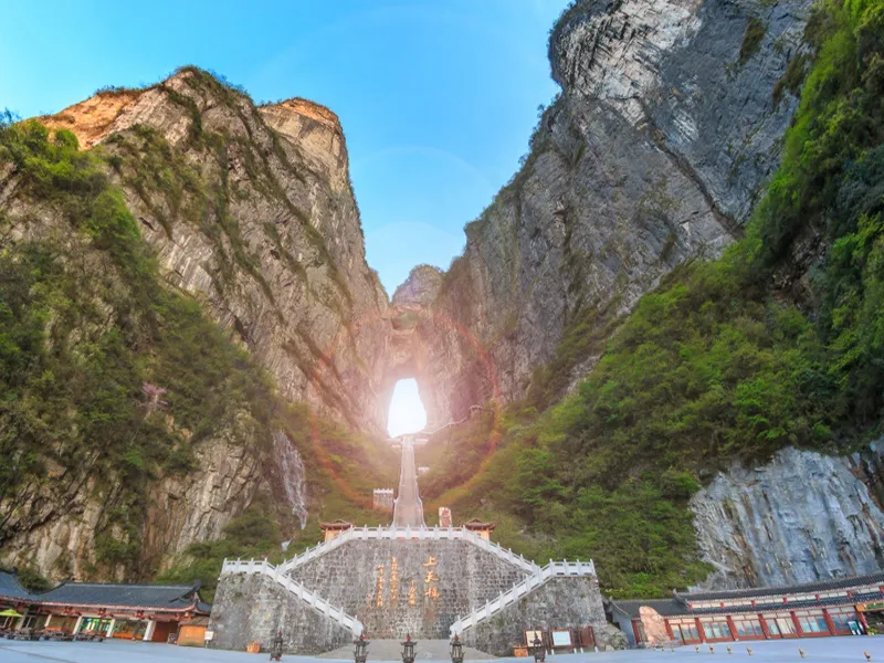 เขาเทียนเหมินซาน หนึ่งในสถานที่ท่องเที่ยวจีนที่มีชื่อเสียงระดับโลกในเขตอุทยานแห่งชาติจางเจียเจี้ย หุบเขาเทียนเหมินมีฉายาว่า “Heaven’s Door Mountain” หรือประตูสู่สวรรค์ จุดที่สูงที่สุดของภูเขาคือ 1,519 เมตรจากระดับน้ำทะเล นอกจากความสวยงามและอุดมสมบูรณ์ทางธรรมชาติแล้ว ความโดดเด่นของที่นี่ก็คือเคเบิลคาร์ขึ้นสู่จุดชมวิวด้านบนของภูเขาที่ยาวที่สุดในโลก ถนน 99 โค้ง เส้นทางคดเคี้ยวสวยงามขึ้นสู่ถ้ำเทียนเหมิน ทางเดินลัดเลาะไปตามหน้าผาสูงชัน และทางเดินกระจกใสที่สูงกว่า 1,400 เมตร สำหรับชมทิวทัศน์ของหุบเขาเทียนเหมินแบบใกล้ชิด